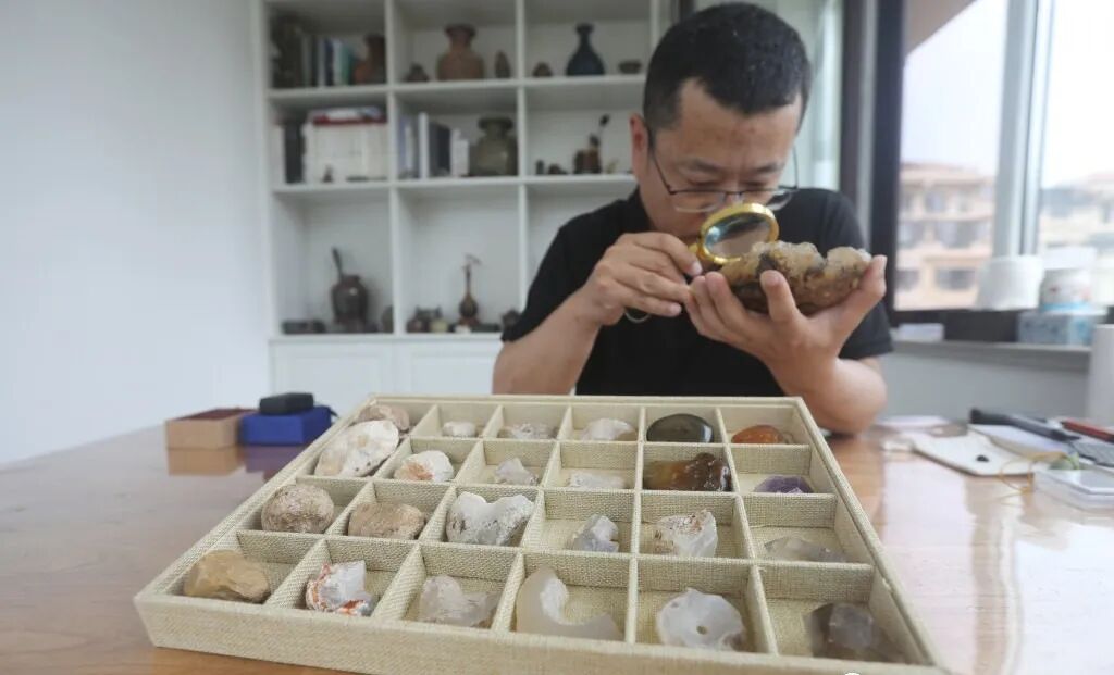 记者在王炜家中工作室看到,他和爱人搜集了近20年的玛瑙、水晶标本,这些标本大部分是春秋战国时期的,都是他从上大学期间开始,多次奔赴内蒙古、陕西等地,从一些老乡家中、古玩市场收来的半成品标本。还有一些成品主要是来自于拍卖行和交流会。从2003年开始,王炜就很痴迷于研究古代的文化,研究春秋战国时期的玉器、水晶和玛瑙器以及相关背景的历史文化,通过对物件的痕迹鉴定和逻辑推理,根据古代文物上残存的痕迹反向推理出来古代加工工艺流程和步骤。研究中王炜发现,在缺乏考古发掘现场的情况下,可以根据器物上的痕迹反向推理出来古代工艺步骤,以及使用的工具,甚至埋藏环境,同时也可以把两者结合起来,在根据痕迹做出推断之后,带着验证的目标去挖掘遗址,这样会更加容易注意到一些被忽略的细微的痕迹,能最大的完善考古过程中的纰漏,为当今考古研究做出了一定的建议。